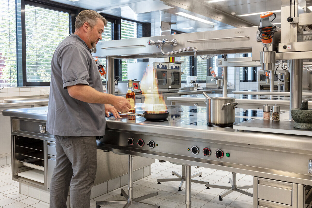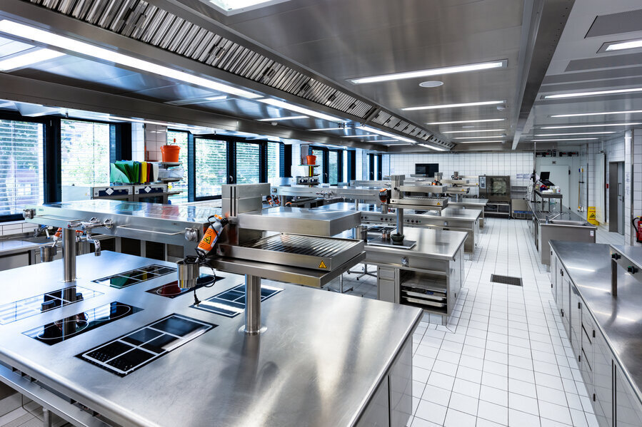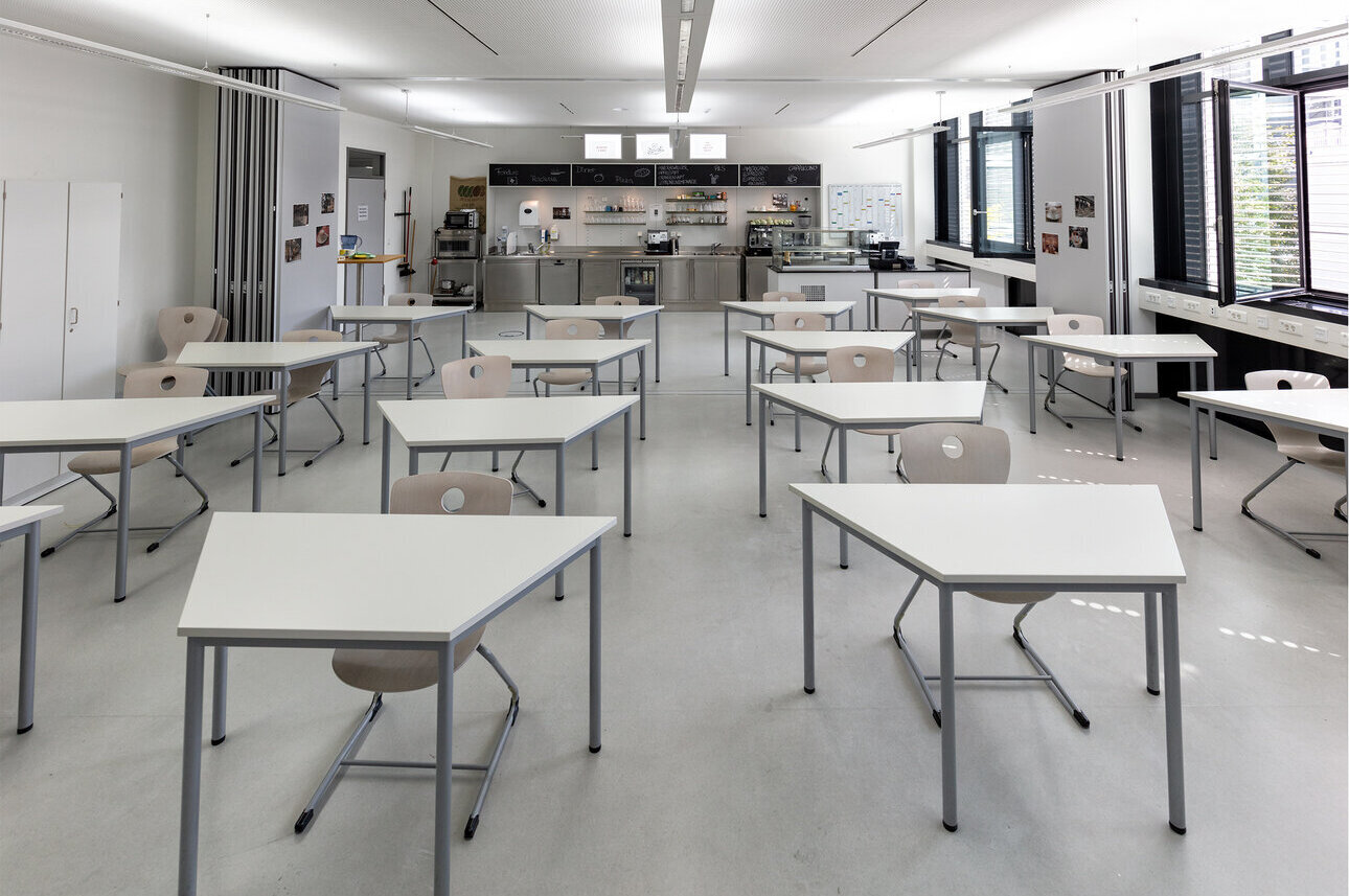 Unsere Praxisräume überzeugen mit einer tollen Ausstattung. Die beiden klimatisierten Küchen sind auf dem neuesten Stand der Technik. Auch eine voll eingerichtete Bar mit Restaurant darf für unseren Praxisunterricht nicht fehlen. Besucht doch auch unser Hotelzimmer. Auch wenn ihr hier nicht wirklich übernachten könnt, lassen sich Szenen aus dem wirklichen Hotelleben nachspielen und nachempfinden. Und auch für unsere Systemgastronomen haben wir passende Räumlichkeiten: Klassenzimmer und Praxisraum in einem. So manche Deutsche Meister wurden hier schon geboren und viele Projekte veranstaltet.